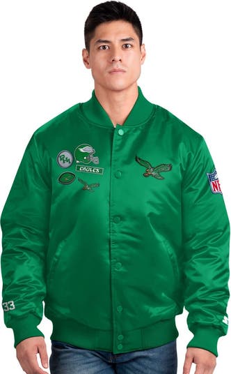 Showcase your devotion to the Philadelphia Eagles by sporting this Exclusive Satin Full-Snap Varsity Jacket from Starter. It boasts tackle twill team appliques that make your fandom undeniable and a football player caricature on the lining for a surprising detail. Satin fabric creates a lustrous finish, making this Philadelphia Eagles jacket a statement piece.