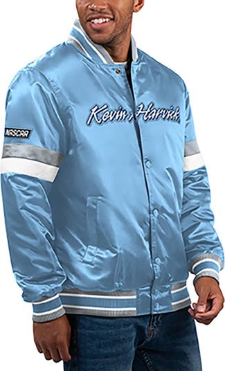 Showcase who you're riding shotgun with on race day in this Kevin Harvick Home Game varsity jacket from Starter. Its full-snap design features glossy satin fabric, traditional striped trim and eye-catching Kevin Harvick graphics. Front pockets keep essential items close at hand for fast access.