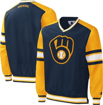 For coverage, style and ease of wear, sport this Yardline pullover windbreaker by Starter. A bold Milwaukee Brewers design with striking team graphics makes for the ultimate look. Its lightweight, nylon construction resists winds and offers coverage for the perfect layering option.