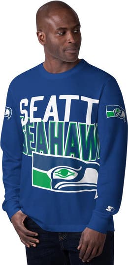 Show your appreciation for your beloved and revered Seattle Seahawks with this Extreme Clutch Hit Vintage Logo Long Sleeve T-Shirt from Starter. Its relaxed fit offers loose comfort across the chest, shoulders and body. The rib-knit collar and sleeve cuffs ensure a snug fit that stays comfortably in place. The oversized printed vintage team logo is designed to celebrate the rich history of the team in a retro fashion and is a true testament to Seattle Seahawks pride.
