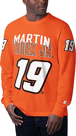 The Men's Starter Orange Martin Truex Jr Clutch Hit Graphic Long Sleeve T-Shirt is a must-have for any Martin Truex Jr fan. Made from a comfortable cotton and polyester blend, this long sleeve tee features bold graphics that showcase your unwavering support for the NASCAR star. Whether you're cheering him on at the track or just showing your pride, this shirt is the perfect way to represent your favorite driver in the NASCAR community.
