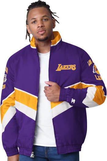 Step out in dipping temperatures with a bold extra layer by nabbing this Los Angeles Lakers Captain Oxford Full-Zip Jacket from Starter. Featuring a team-colored design broken up by Chevron inserts featuring the team's secondary color, this full-zip jacket features a Los Angeles Lakers wordmark on the left chest that leaves no doubt about your enthusiasm for your NBA squad. The crinkle finish provides a vintage look that will have you reaching for this full-zip option before the next big game time and time again.