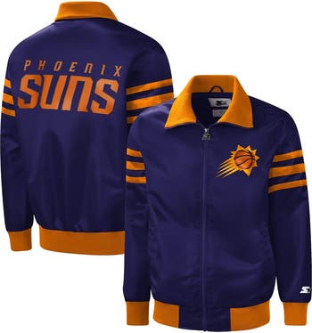 For a bold display of Phoenix Suns loyalty, The Captain II jacket from Starter leads the way. Its sleek Phoenix Suns appliques on the front and back are accentuated by stripes and rib-knit trim in a contrasting team color. Adding in glossy satin fabric and a classic varsity design, this full-zip jacket puts all eyes on your undeniable fandom.