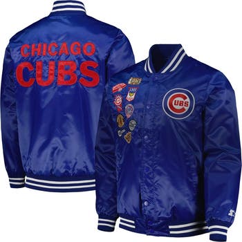 Showcase a snapshot of Chicago Cubs history when you sport this Patch full-snap jacket from Starter. Its glossy satin fabric features some of the most notable milestones for the Chicago Cubs franchise and the team name displayed across the back. Coordinating stripes complete the timeless look of this varsity jacket.