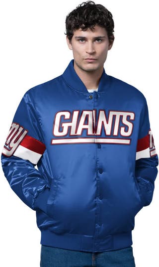 Rep your team in style with this New York Giants Triple Option Satin Varsity Full-Snap Jacket from Starter. With its rib-knit standup collar, cuffs, and hem, this midweight jacket is perfectly suited for moderate temperatures. The embroidered fabric applique wordmark at the chest and team logos on both sleeves boldly declare your New York Giants pride.