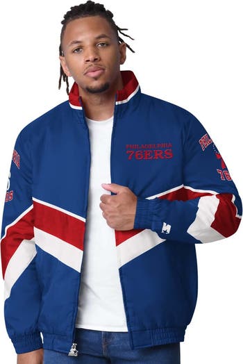 Step out in dipping temperatures with a bold extra layer by nabbing this Philadelphia 76ers Captain Oxford Full-Zip Jacket from Starter. Featuring a team-colored design broken up by Chevron inserts featuring the team's secondary color, this full-zip jacket features a Philadelphia 76ers wordmark on the left chest that leaves no doubt about your enthusiasm for your NBA squad. The crinkle finish provides a vintage look that will have you reaching for this full-zip option before the next big game time and time again.