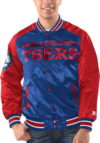 Draw attention to your personal style and Philadelphia 76ers devotion in this Renegade Varsity Satin full-snap jacket from Starter. Its contrast-color design highlights the Philadelphia 76ers team name in big, bold lettering across the front and their official logo on the back. You're sure to feel like an all-star fan when you sport this striking piece of outerwear.