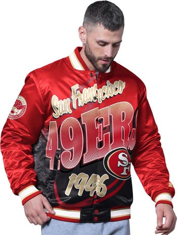 Stand up and cheer for a San Francisco 49ers sack in this Pass Rush Varsity Full-Snap Jacket from Starter. Designed with Starter 1980s nostalgia, this midweight jacket is perfect for moderate temperatures, offering comfort whether you're at the stadium or out for the evening. Bold, sublimated custom team graphics proudly display the established year on the front and the main logo across the back. Complete with striped, rib-knit trim for a snug fit and convenient side pockets, this jacket - finished with a twill appliqu patch on the sleeve - is the ultimate way to show your team pride on game day.