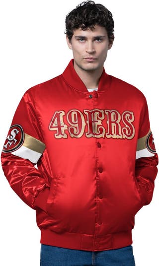 Rep your team in style with this San Francisco 49ers Triple Option Satin Varsity Full-Snap Jacket from Starter. With its rib-knit standup collar, cuffs, and hem, this midweight jacket is perfectly suited for moderate temperatures. The embroidered fabric applique wordmark at the chest and team logos on both sleeves boldly declare your San Francisco 49ers pride.