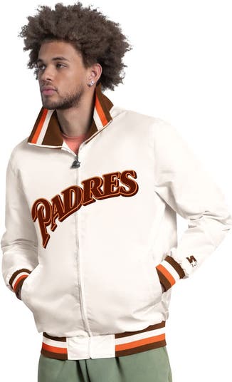 Feel the echoes of legendary San Diego Padres moments every time you zip up this The Captain Cooperstown Logo Full-Zip Varsity Jacket from Starter. This midweight jacket features satin fabric and embroidered fabric applique graphics, delivering a vintage-inspired aesthetic that honors the club's storied past. Designed with an olympic collar, rib-knit, striped cuffs and waist hem, and locker loop, this jacket ensures a comfortable, secure fit, whether you're at the stadium or strolling the streets. With its 100% polyester construction and two front slip pockets, this Starter varsity jacket effortlessly blends iconic style with everyday functionality, making it a must-have for any dedicated San Diego Padres fan.