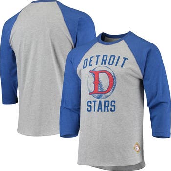 The Men's Stitches Heathered Gray/Royal Detroit Stars Negro League Wordmark Raglan 3/4-Sleeve T-Shirt is a must-have for any Detroit Stars fan. This stylish and comfortable shirt features a vintage-inspired design with distressed screen print graphics and a printed league patch. The flatlock stitching details and rounded hem with serged stitching add a touch of sophistication to this classic tee. Whether you're cheering on the Detroit Stars at the ballpark or just showing your support for your favorite Negro League team, this shirt is the perfect way to represent your love for the game.