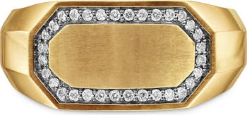 Subtle facets and a pavé diamond halo lend extra shine to this signet ring crafted from 18-karat gold.