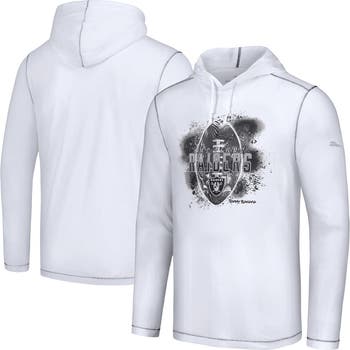 The Tommy Bahama White Las Vegas Raiders Graffiti Touchdown Pullover Hoodie is the ultimate way to show your unwavering support for the Las Vegas Raiders. This lightweight hoodie is perfect for mild temperatures, featuring screen-printed graphics that boldly display your Raiders pride. The contrast-color stitching adds a touch of style, making this hoodie a must-have for any true Raiders fan.