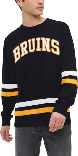 The Tommy Hilfiger Black Boston Bruins Nolan Long Sleeve T-Shirt is a must-have for any true Boston Bruins fan. With bold screen print graphics and sewn-on stripes, this shirt proudly displays your allegiance to the Bruins. The embroidered fabric applique adds a touch of sophistication, while the crew neck ensures a comfortable fit. Whether you're cheering from the stands or just showing your support, this shirt is the perfect way to represent the Boston Bruins.