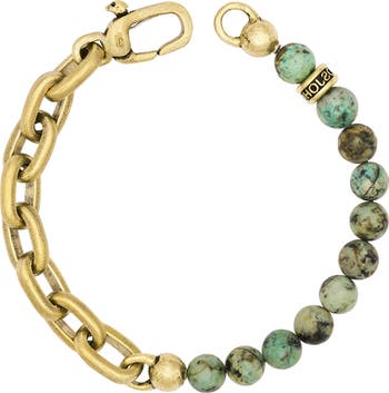 The smooth sheen of turquoise beads contrasts the matte texture of chain links in this mixed-media bracelet detailed with subtle logo branding.