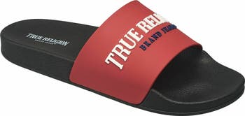The True Religion Men's Weezy Slides are a contemporary and comfortable footwear choice designed to blend ease with style. Featuring a sleek, minimalist design, these slides are characterized by their broad strap that comfortably secures the foot while showcasing the True Religion logo for a touch of modern branding. The strap is crafted from high-quality synthetic materials, ensuring both durability and a snug fit