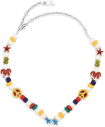 The brand's double star logo steals the show on a pendant necklace strung with enameled beads and illuminating pearls.