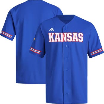 Rep your favorite team in style with this Kansas Jayhawks Replica Baseball Jersey from adidas. This replica jersey is built with lightweight, breathable fabric and features a classic full-button front, making it perfect for game day or any day you want to show your Kansas Jayhawks spirit. The sewn-on fabric applique team wordmark at the chest proudly displays your Kansas Jayhawks pride in contrasting colors.
