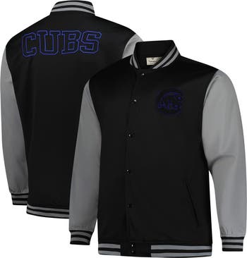 Represent your Chicago Cubs fandom with this Profile Full-Snap Varsity Jacket. This stylish jacket boasts a classic varsity design with a contemporary edge, featuring a rib-knit collar, hem and sleeve cuffs for a snug and comfortable fit. The smooth, non-bulky fabric makes it ideal for layering, while the chenille team logo at the left chest and embroidered team wordmark across the top back proudly display your Chicago Cubs pride.