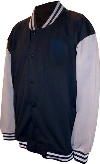 Represent your New York Yankees fandom with this Profile Full-Snap Varsity Jacket. This stylish jacket boasts a classic varsity design with a contemporary edge, featuring a rib-knit collar, hem, and sleeve cuffs for a snug and comfortable fit. The smooth, non-bulky fabric makes it ideal for layering, while the chenille team logo at the left chest and embroidered team wordmark across the top back proudly display your New York Yankees pride.
