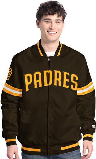 Show off your San Diego Padres spirit with this Starter Scout Full-Snap Varsity Jacket. This stylish varsity jacket features classic rib-knit accents on the collar, cuffs and hem. The embroidered San Diego Padres wordmark on the chest and team logos on the sleeve and back make a bold statement of team pride.
