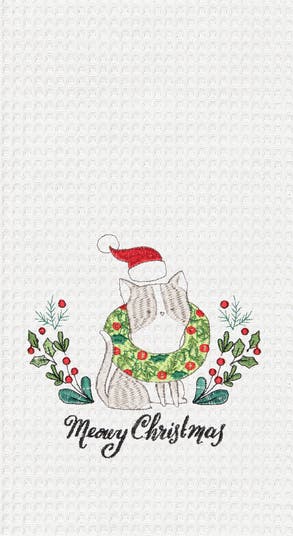 - Features an adorable embroidered cat wearing a Santa hat above the playful phrase "Meowy Christmas." The detailed stitching and soft waffle weave texture create a fun, whimsical design that enhances your kitchen with joyful Christmas spirit.