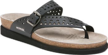 Hand-finished perforated straps with an adjustable buckle top a contoured footbed and flexible sole in this toe-loop sandal with shock-absorbing Soft Air technology.