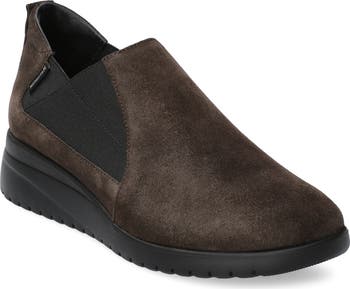 Stretchy insets add grab-and-go ease to this streamlined slip-on sneaker elevated on a low, cushioned wedge and grippy sawtooth sole.