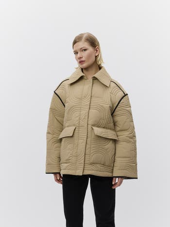 Sculptural quilting sculpts a modern boxy silhouette, generous collar and streamlined panels promise cozy warmth and casual confidence.