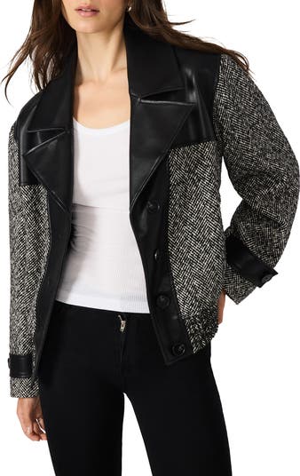 Faux leather trim and classic herringbone mix edgy and refined on this staple jacket that's destined to keep you stylishly cozy.