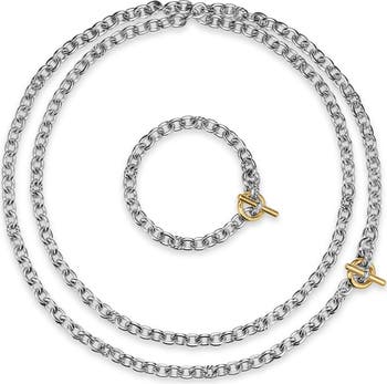 Inspired by the artistic energy and bustling rhythm of downtown NYC, this convertible necklace offers a new iteration of a standard oval link chain featuring links of alternating lengths, modern toggle elements and a more relaxed oval shape. Wear as two separate chains or link together for extended versatility.