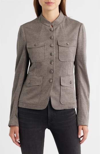 Neutral hues pattern a smart ponte jacket topped with a pared-back collar and presented with plenty of pocket space.