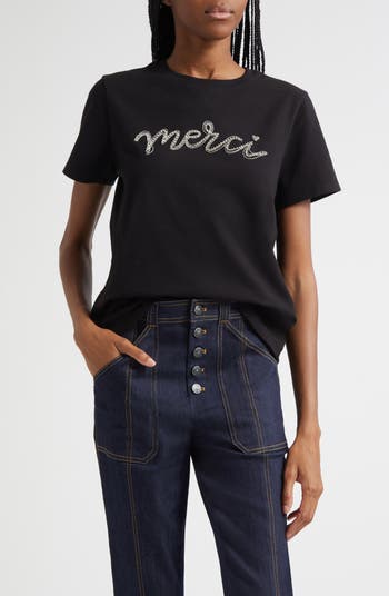 A charming French phrase made from chain and sparkling stones decorates the front of this relaxed fit T-shirt made from comfortable stretch cotton.