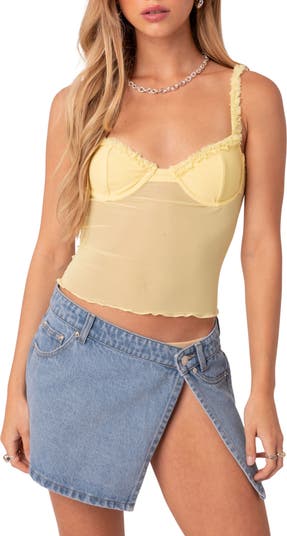 A charming ruffle detail trims the neckline and straps of this alluring bra top featuring a partially sheer mesh design and underwire cups.