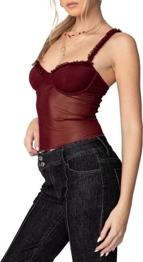 A charming ruffle detail trims the neckline and straps of this alluring bra top featuring a partially sheer mesh design and underwire cups.