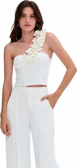 - This top features our Merian Knit material with a one shoulder laser cut flower applique design into a fitted corset style top with built in boning for structure. Exposed back zipper closure. Made in Brazil. 96% Polyamide 4% Elastane. TOP31828