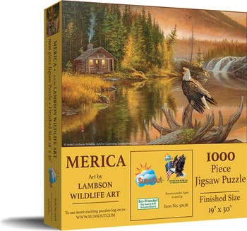 Immerse yourself in the gorgeous tranquility of nature with the SUNSOUT INC Merica 1000 piece jigsaw puzzle. Featuring the stunning artistry of Lambson's Wildlife Art, this puzzle offers an escape into a vibrant landscape scene for peaceful solitude or family bonding moments. Each puzzle piece is carefully crafted in the USA from eco-friendly soy-based inks and robust recycled cardboard, promising not just a sustainable form of entertainment, but also durability. With our precision-fit, random-shaped puzzle pieces, assembly is a breeze, yet simultaneously engaging enough to ignite your problem-solving skills. SunsOut guarantees a worry-free adventure with the commitment to replace missing or damaged pieces, assuring an enjoyable puzzle journey with our dedicated customer service. Upon completion, measuring 19" x 30", this puzzle emerges as a tribute to the vibrant colors and intricate details of Lambson's Wildlife Art, a display-worthy celebration of nature and art. Join in the tradition of a proudly American, woman-owned small business, and partake in this testament to quality, creativity, and passion for art, nature, and community with the SUNSOUT INC Merica puzzle today.