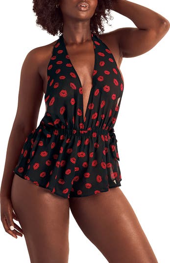 This flirty and sheer romper is perfect for a romantic night in. The romper features a plunging neckline, self-tie halter straps, and bows at the side of the waist.