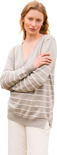 Our Merino V-Neck sweater has been seamlessly knitted in Britain with full-length sleeves and a ribbed hem and cuffs. The clean, luxury handle of the merino wool offers warmth to a traditional v-neck style in a contemporary breton stripe design. Whether you're layering up for the evening or keeping it casual, this sweater is a versatile choice for any occasion