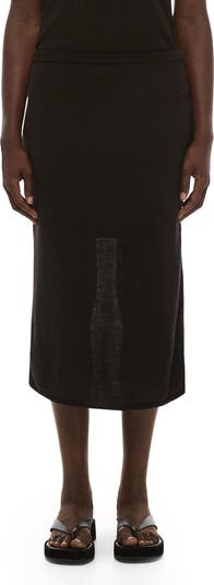 This sweater-style midi skirt is knit from Italian merino wool in a loose gauge and fashioned with a mini-length lining to highlight the semisheer design.