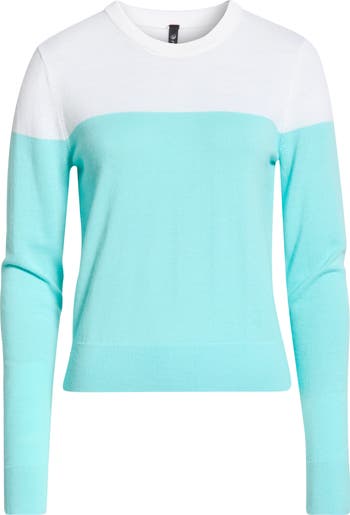 A close-fitting fine-gauge sweater is knit from soft merino wool and accented with vivid colorblocking.