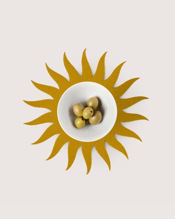 The Sunburst Trivet brings sculptural energy to everyday dining with its radiating design and dimensional texture. Crafted from dense Merino wool, it naturally insulates and protects surfaces from heat while absorbing moisture and condensation