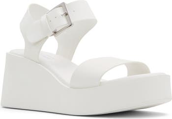 A chunky platform brings leg-lengthening height to this sleek, minimalist slide sandal secured with a gleaming ankle buckle.