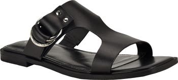 Make a modern statement in this smooth leather slide sandal embellished with a decorative buckle strap.