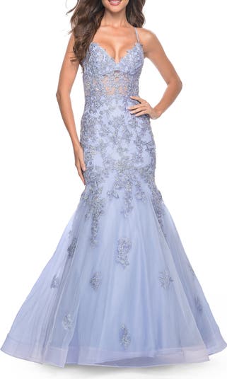 Mermaid prom gown with gorgeous lace applique and illusion waist. Open lace up back. Back zipper closure.