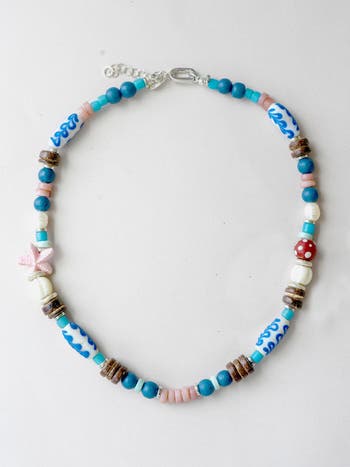 Dive into the vibrant world of the reef with our MERMAID NECKLACE. Swim with the fish and feel like a mermaid, adorned in Venetian-style beads, hand-painted ceramic accents, pink Java, and white glass beads. A true celebration of color and oceanic beauty.