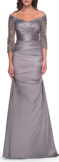 Off the shoulder satin gown with gathering throughout the body. Lace back and illusion lace three quarter sleeves. Back zipper closure.