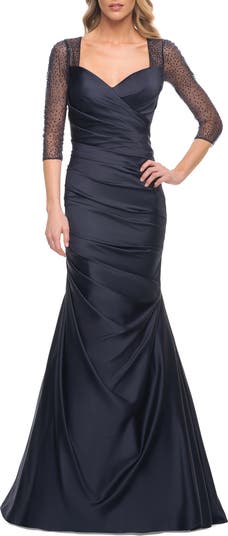 Pleated long mermaid gown with sheer beaded three-quarter sleeves. Back zipper closure.