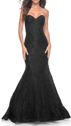 Mermaid stretch lace evening gown with bustier top and illusion back. Back zipper closure.