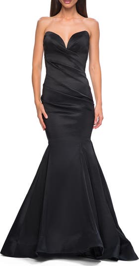 Mermaid stretch mikado evening dress with a chic pleated design and strapless bodice. The back features exposed boning and illusion panels. Back zipper closure.